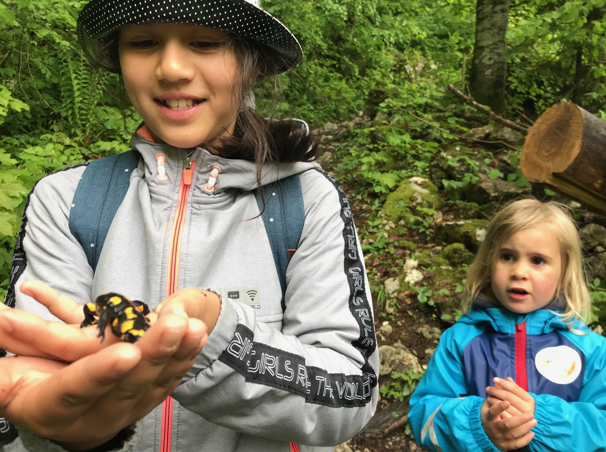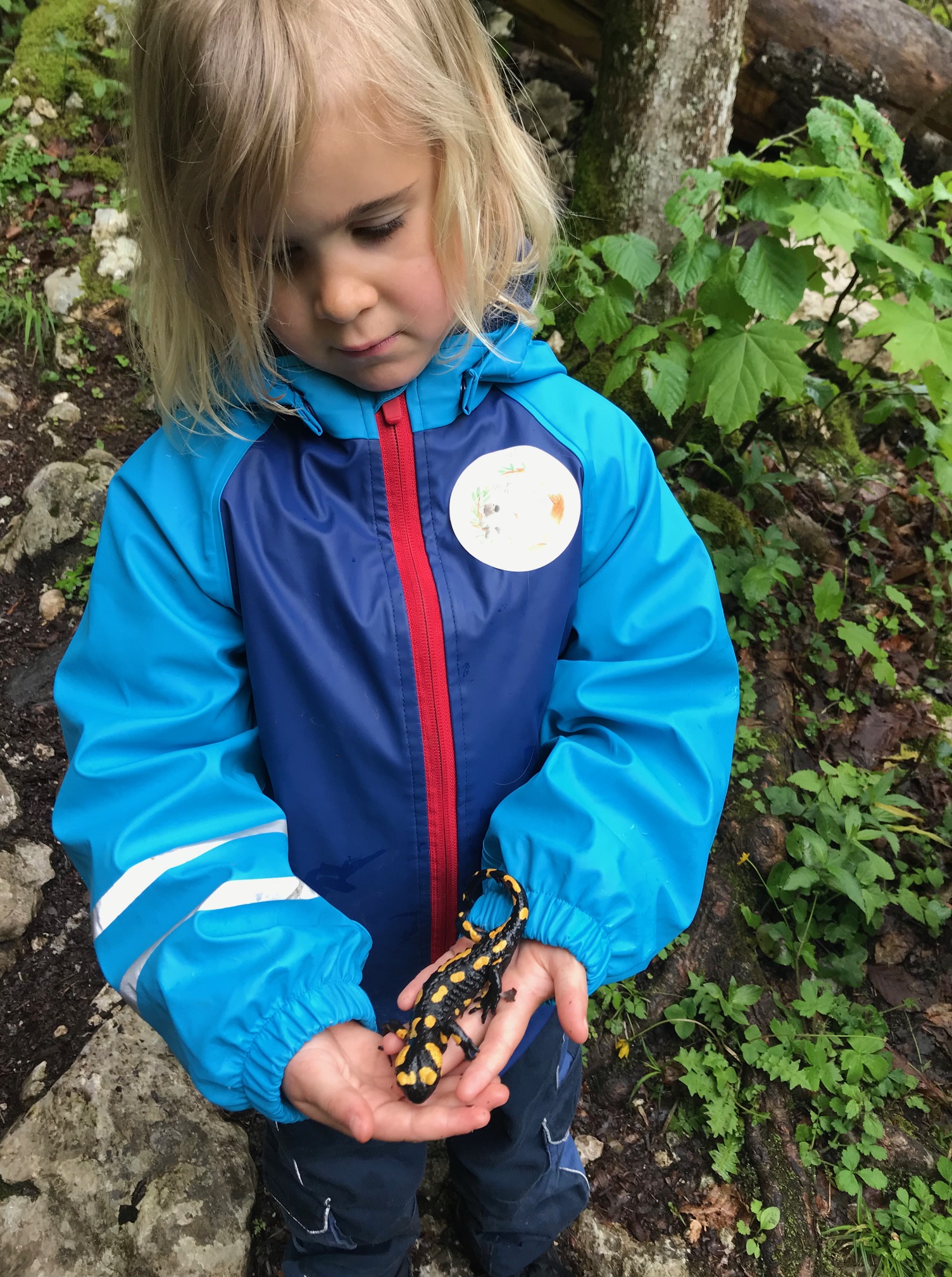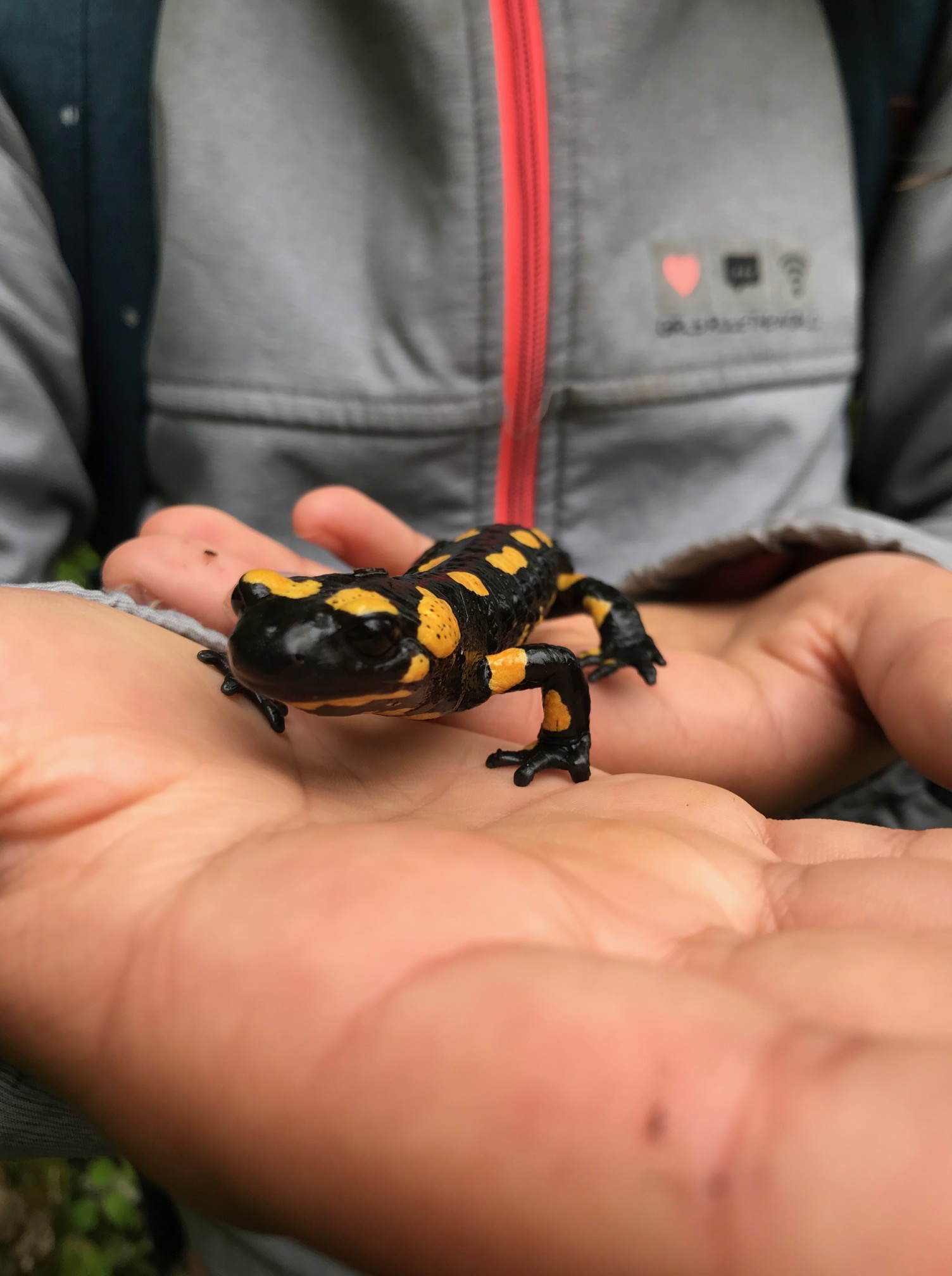 Welch tolle Begrüßung hatten wir gleich bei unserem ersten „richtigen“ Treffen: Ein Feuersalamander hat gemütlich unseren Weg gekreuzt! Nachdem er unsere Hände erkundet hat und wieder zurück in seine natürliche Umgebung durfte, gab es kein Halten mehr: