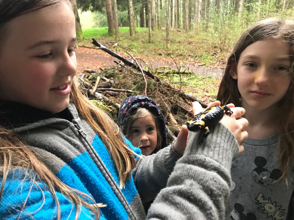 Auch von Regen lassen wir uns die gute Laune nicht verderben: Letztens haben wir die Steinklüfte besucht. Dort lässt sich allerlei entdecken und bei Regen finden sich dort genug trockene Plätzchen für eine gemütliche Jause. Tatsächlich hat es erst am Beginn des Heimweges zu regnen begonnen – dafür wie aus Eimern! Und doch- plötzlich war all der Regen vergessen: Ein Feuersalamander hat die Kinder in ihren Bann gezogen. Kennt Ihr das: Wenn man erst mal so richtig nass ist, sorgen die Endorphine für wahres Glücksgefühl und ausgelassene Freude!