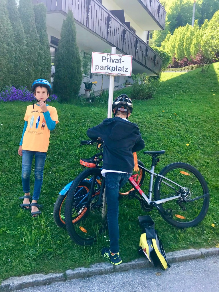 Seit der Fahrradprüfung der Viertklässler reisen ein paar Kinder „CO2-neutral“ an. Wie praktisch, dass es dafür einen eigenen Privatparkplatz gibt 😉