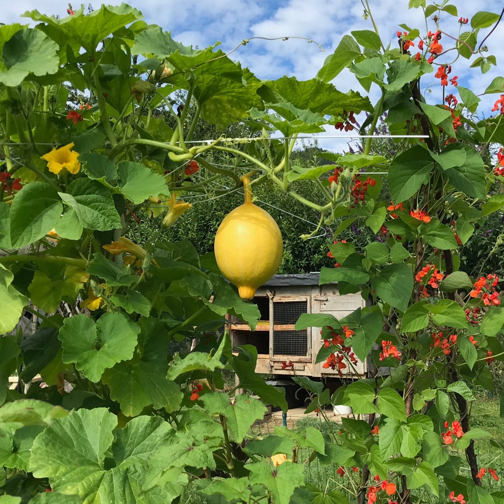 Nun ja, ist „Obstgarten“ hier eigentlich die richtige Bezeichnung? Tatsächlich haben wir gleich zu Beginn ausgelotet, wo die Sonne am stärksten scheint. Genau dort haben wir drei langgezogene Beete angelegt. Das war richtig anstrengende Arbeit, dafür sind das auch heute noch unsere besten Beete: Die Obstbäume schützen den Boden im Sommer vor übermäßiger Austrocknung und im Winter vor Wind und Kälte. Bis heute haben wir dort die feinste, lockere Erde, die unser Gemüse gut wachsen und gedeihen lässt. Und im Herbst? Da regnet es dann leckere Äpfel!